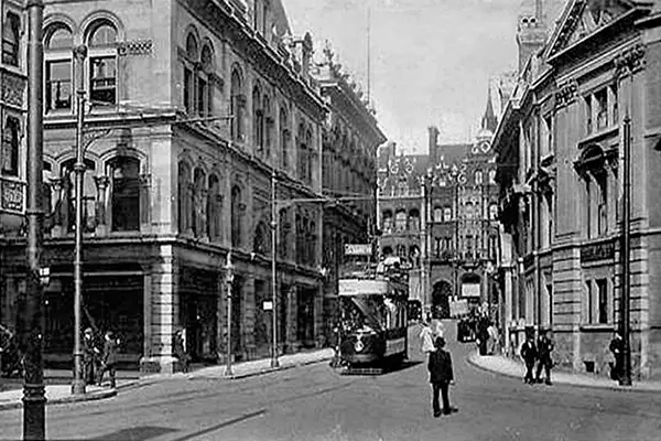 Before the Corn Exchange was built in the early 1880s, the corner of King Street looked very different to today. Princes St. was then a new street giving tram access to the railway station, while King Street had once extended eastwards directly into Buttermarket. The building of the new Victorian Corn Exchange behind the Town Hall at the King St. end of Buttermarket together with the development of many new commercial banks dramatically changed the area into the character we know today, while at its centre opposite Dial Lane the famous Ancient House still proudly stood just as it was built all those centuries ago, and as it still does today to remind us that the town centre uniquely retains much of its medieval human scale and character.